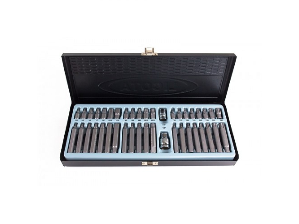 Размер привода: 10 мм HEX;Биты 30 мм HEX (7 шт): Н4, Н5, Н6, Н7, Н8, Н10, Н12;Биты 75 мм HEX (7 шт): Н4, Н5, Н6, Н7, Н8, Н10, Н12;Биты 30 мм Torx (8 шт): Т20, Т25, Т30, Т40, Т45, Т50, Т55, T60;Биты 75 мм Torx (8 шт): Т20, Т25, Т30, Т40, Т45, Т50, Т55, T60;Биты 30 мм Spline (5 шт): М5, М6, М8, М10, М12;Биты 75 мм Spline (5 шт): М5, М6, М8, М10, М12;Адаптер 3/8” под биты;Адаптер 1/2” под биты