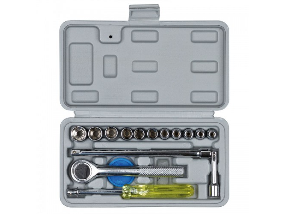 Набор головок 17 предметов. 11 головок, 2 удлинителя, 1 трещётка, 1 насадка кардан, штифт для обточки. Жесткий пластиковый ящик.