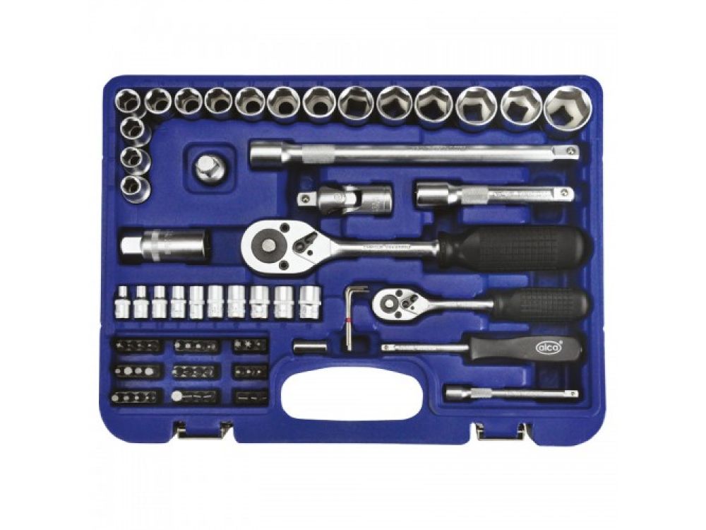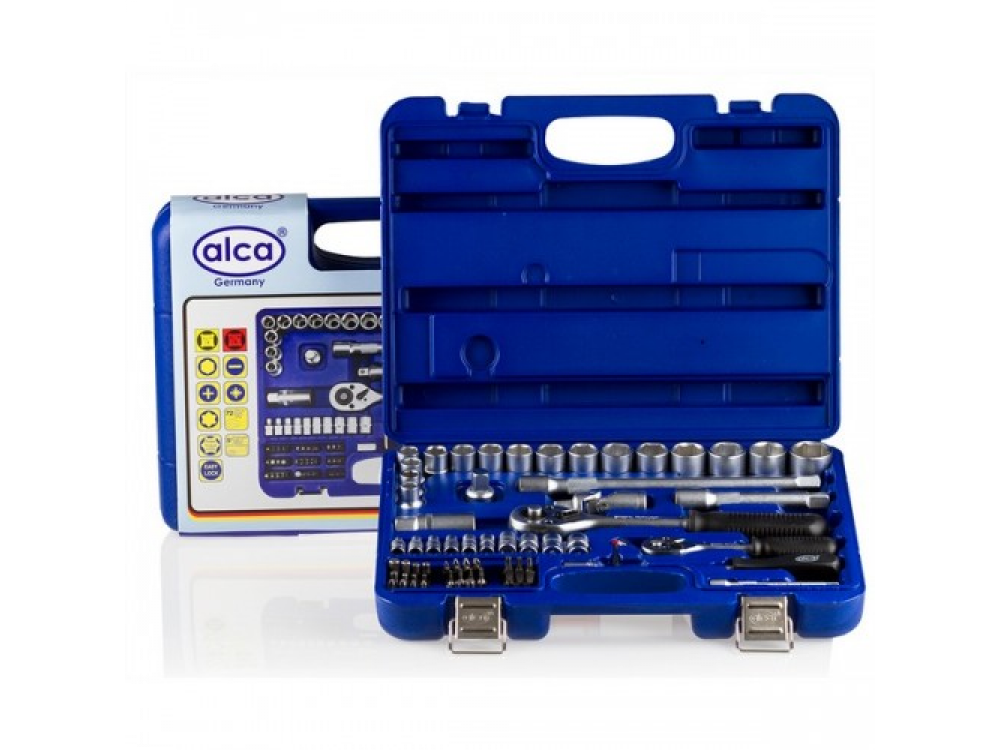 Набор головок, 72 предметов. [?] 16 — шестигранных головок 10-27 мм. 1- трехкратный адаптер. 1- ключь для свечей зажигания 21 мм. 2 удлинителя 12 см. и 25 см. 1 трещетка [?] 10- шестиграных головок 4-13 мм. 33 - биты (-) 3-7: (+) 1,2,3: (*) 1,2,3: (T) 8-50: (H) 2-8. 1 - удлинитель 10 см. 1 - соединительный штекер. 3 - шестигранных ключа. 1 - трещетка. 1- рукоятка с внутренним и наружним квадратом. Качественная ванадиевая сталь. Крутящий момент +15%. Крепкий инструментальный ящик.