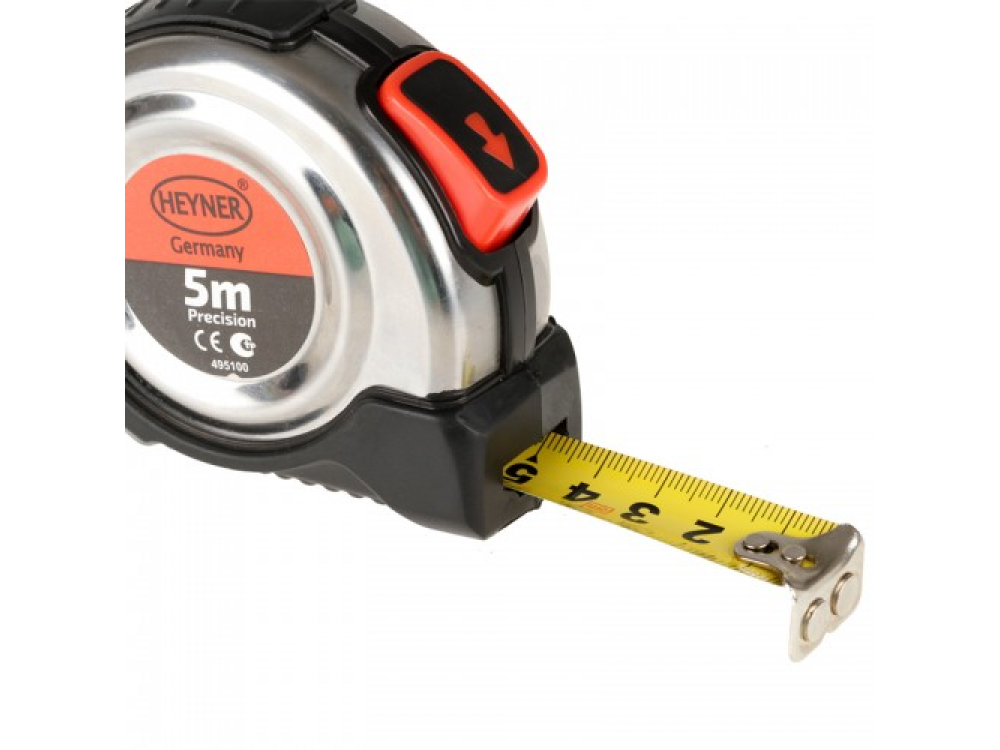 Рулетка профессиональная 5 м. Функция - автоматический стоп. Металлический корпус резиновым покрытием. Поясной зажим и наручный ремешок.