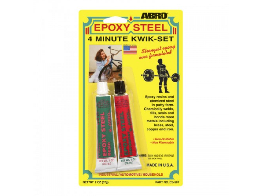 Клей ABRO содержит эпоксидные смолы и измельченную сталь. Применяются эпоксидные клеи для химической сварки, заполнения, герметизации и склеивания дерева, пластика и большинства металлов, включая латунь, сталь, медь, железо, и т. п. Эпоксидный клей надежно склеивает и обеспечивает хороший внешний вид. Устойчив к бензину, антифризу и большинству растворителей. Эпоксидный клей может применяться для сломанных велосипедов, растрескавшихся картеров коробки передач, тормозных колодок, всасывающих труб, поврежденных шпоночных канавок, трещин в обшивке, растрескавшейся батареи, бензобаков.