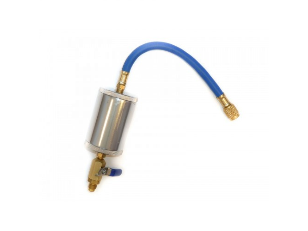 Цилиндр служит для заправки нужного количества масла в систему кондиционирования. Цилиндр включается в магистраль между баллоном с фреоном и манометрическим коллектором. Необходимое количество масла заправляется с потоком хладагента.